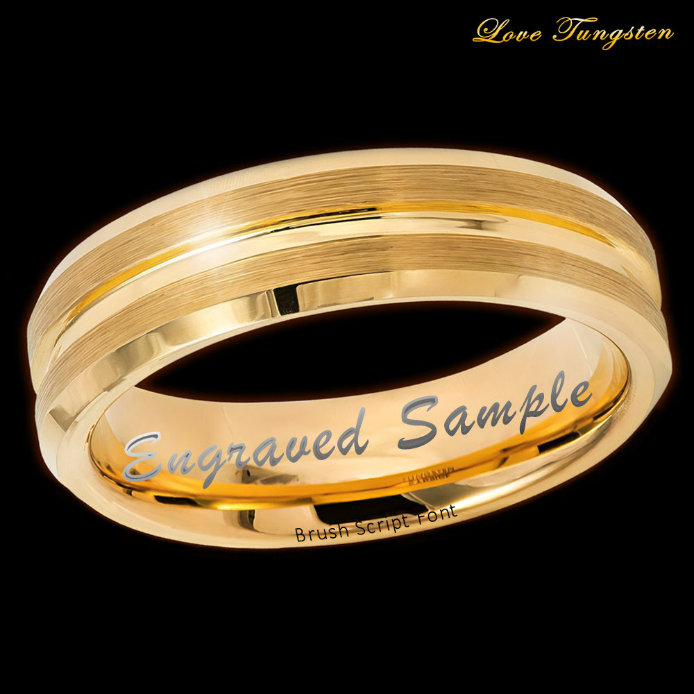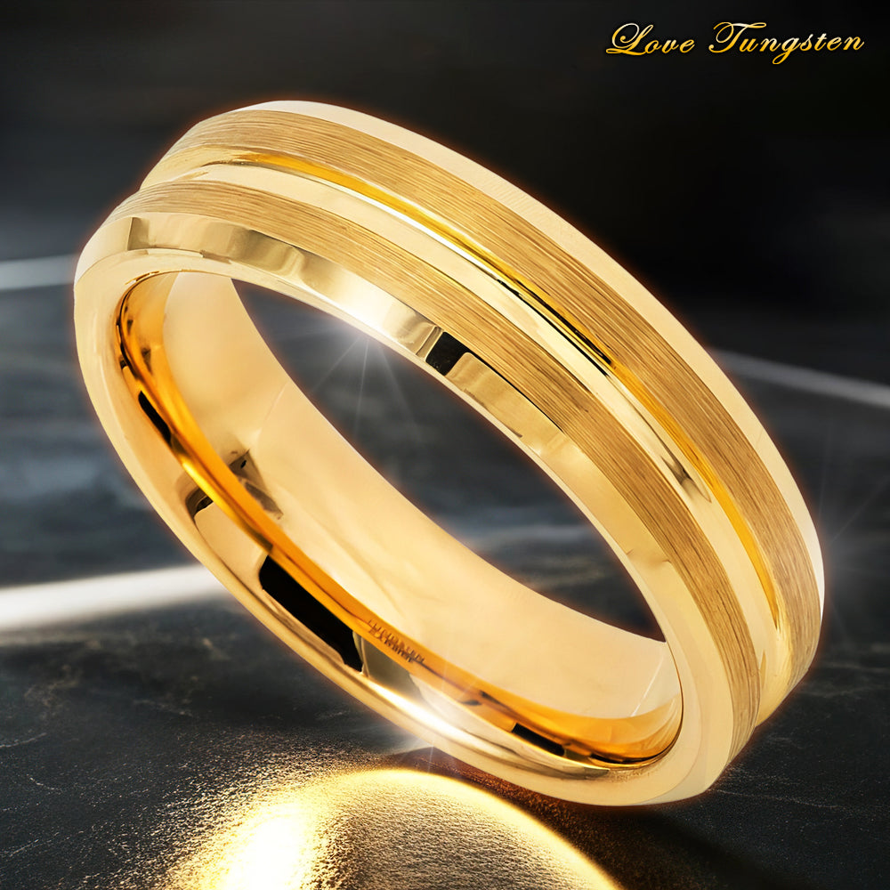 The 6mm width offers a comfortable fit, and the grooved center adds depth and visual interest to the ring. Whether you're looking for a fashionable accessory or a unique wedding band, our Tungsten Ring Yellow Gold IP Plated Grooved Center Brushed Tungsten Ring is sure to impress.