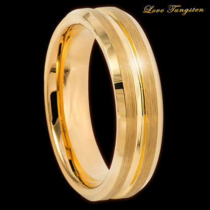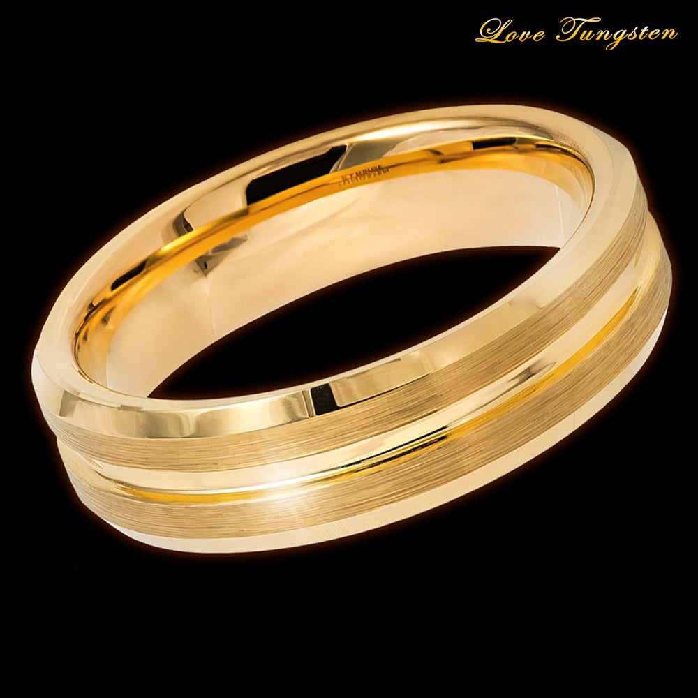 Elevate Your Style with the Yellow Gold IP Grooved Center Tungsten Ring - 6mm