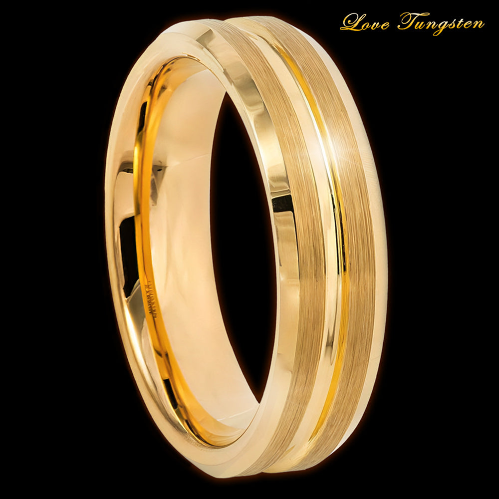 6mm Yellow Gold IP Tungsten Ring with Grooved Center | Sleek & Durable Design