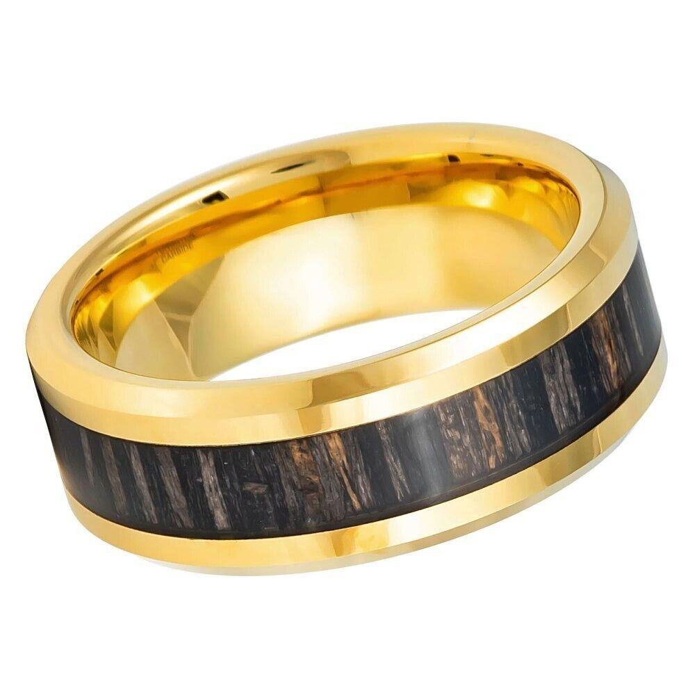 Make a Bold Statement with our Yellow IP Plated Zebra Wood Inlay Tungsten Ring - 8mm