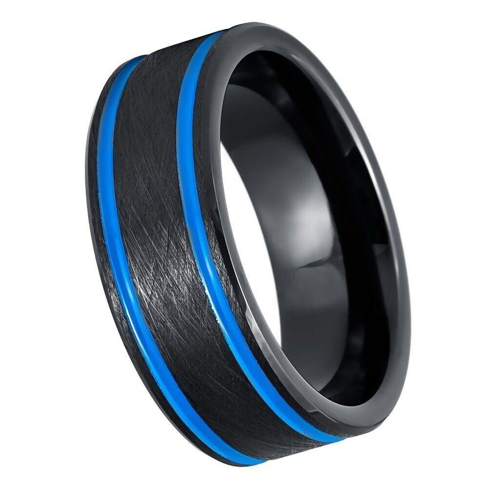The beveled edge enhances the ring's visual appeal and adds a modern touch. With its 8mm width, it offers a comfortable fit for everyday wear. Whether you're looking for a stylish accessory or a distinctive wedding band, our Black IP Beveled Edge, Blue IP Off Center Grooves Tungsten Ring is a perfect choice.
