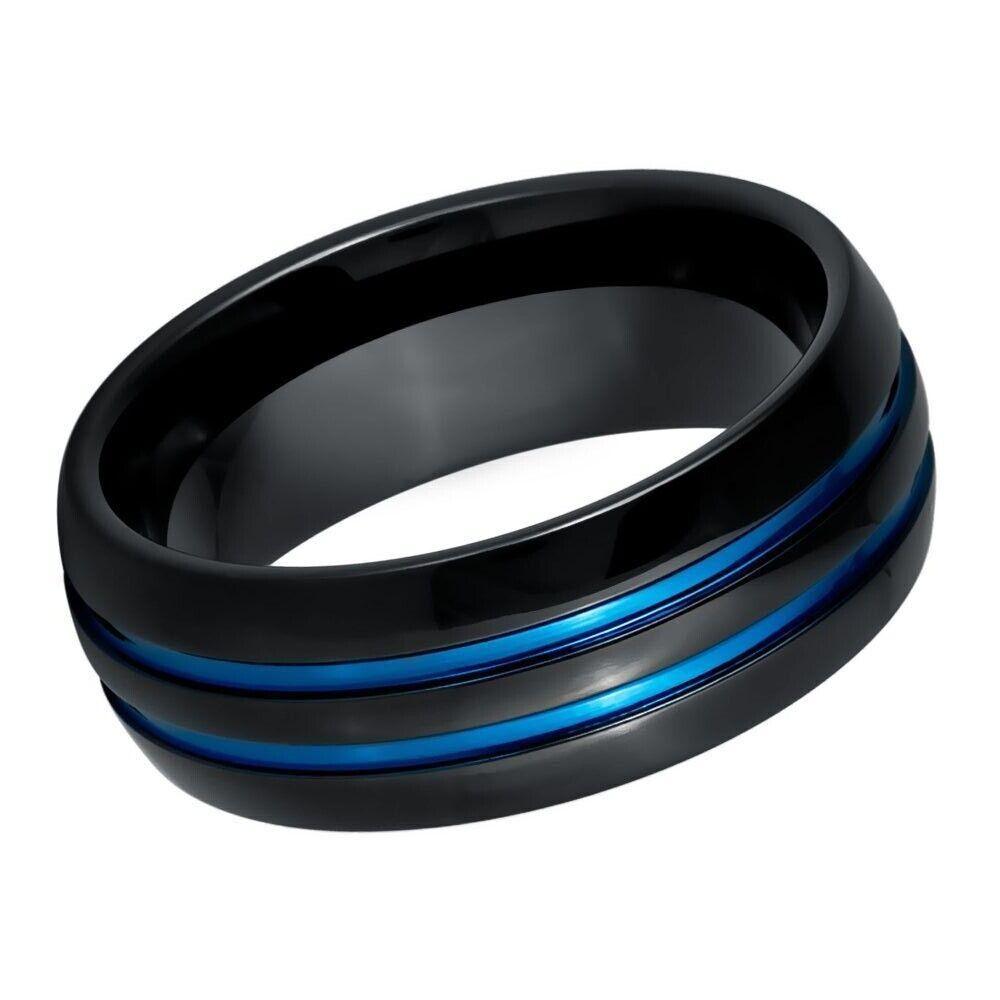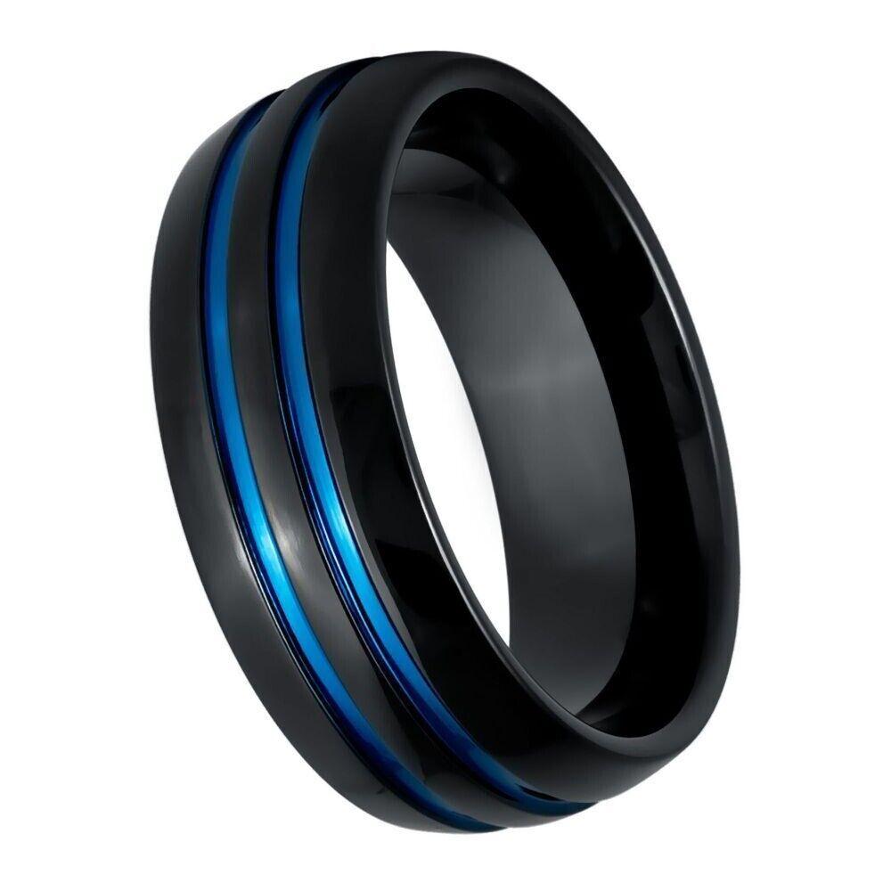 Experience the sleek and modern design of our 8mm Black IP Plated Domed Tungsten Ring with 2 Blue IP Grooves. The black IP plating adds a sophisticated touch, while the blue IP grooves create a striking contrast.