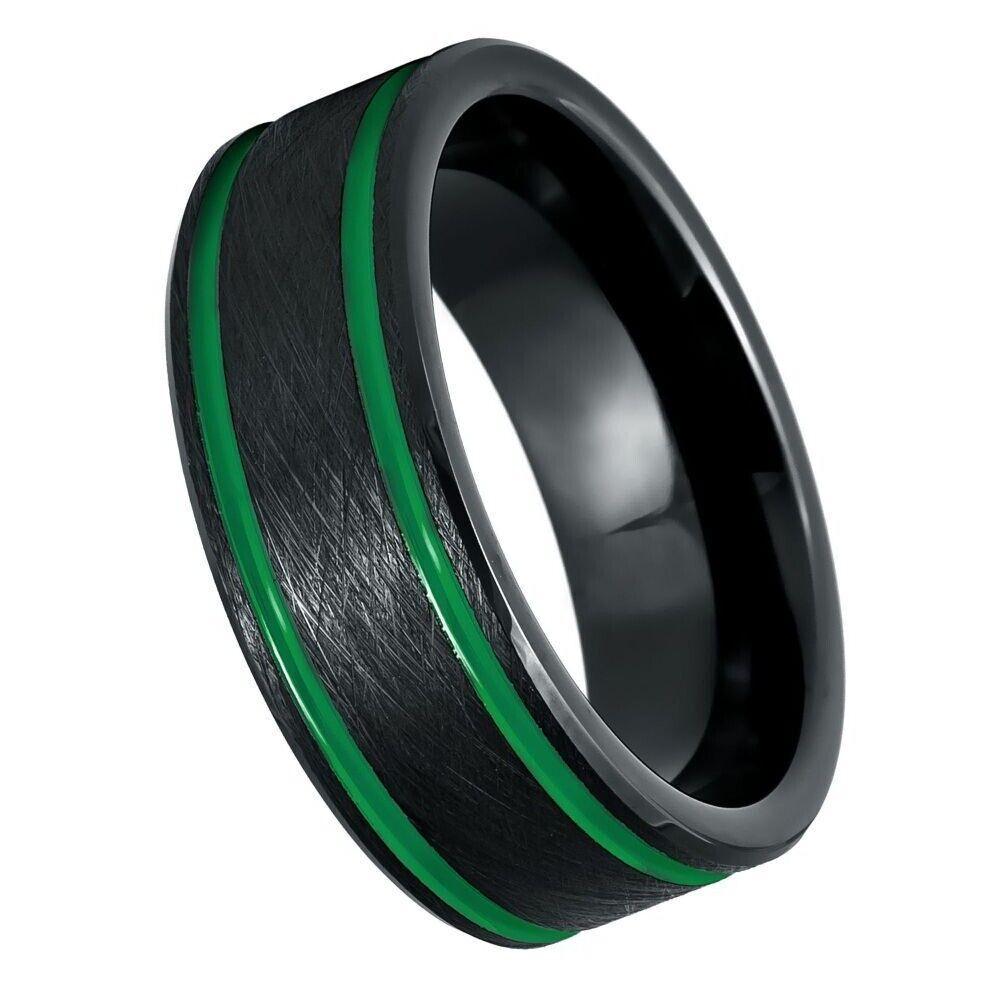 Elevate Your Style with Our 8mm Black IP Tungsten Ring: Ice Finish and Green Lines