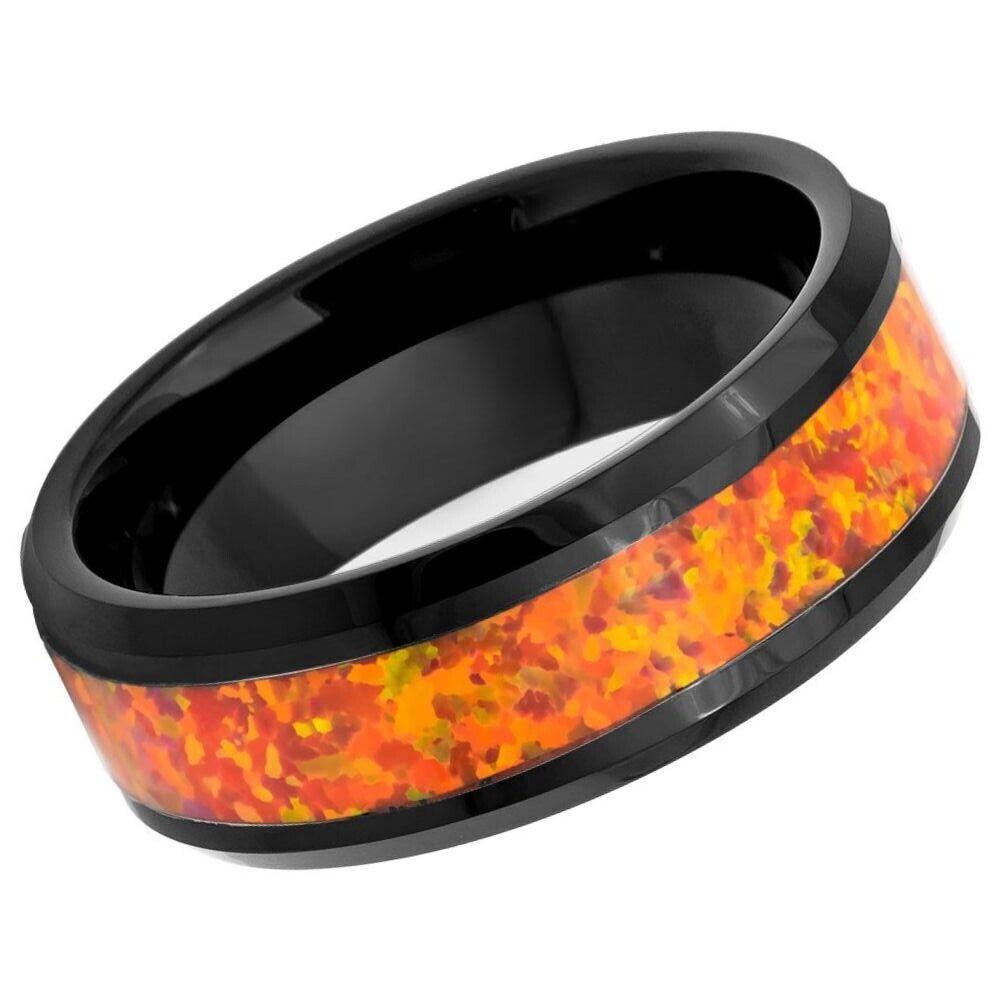 Make a Bold Statement with Our 8mm Black IP Tungsten Ring: Synthetic Orange Opal Inlay