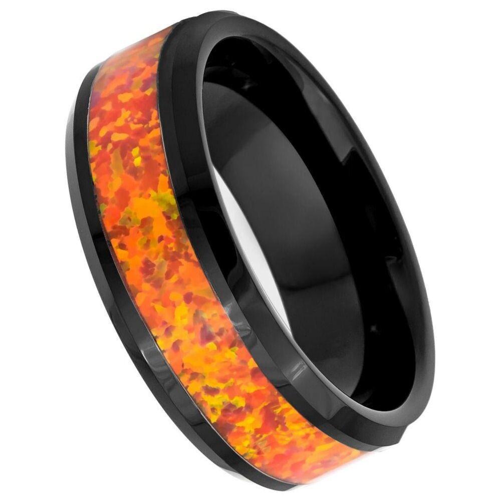 Crafted with high-quality materials, this tungsten ring is designed to be durable and long-lasting. The 8mm width offers a comfortable fit, making it suitable for both men and women. Whether you're looking for a stylish accessory or a unique wedding band, this Black IP Tungsten Ring with Synthetic Orange Opal Inlay is sure to impress.