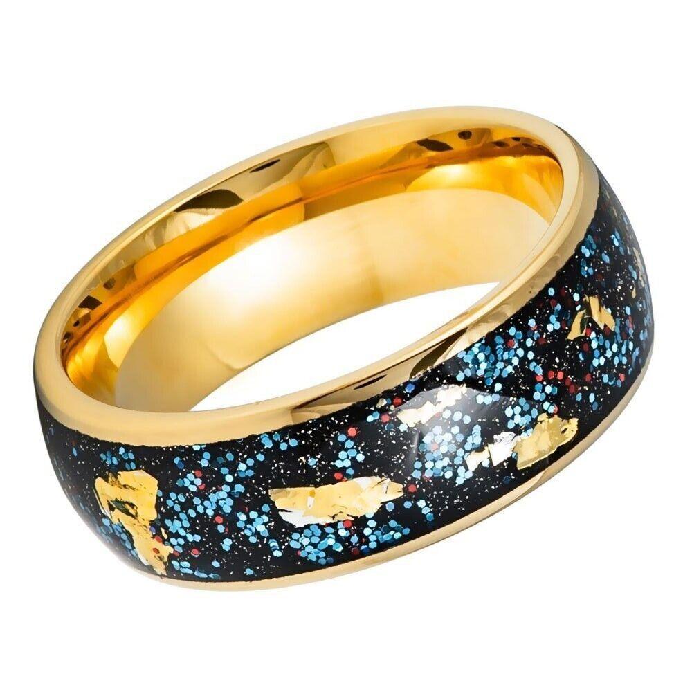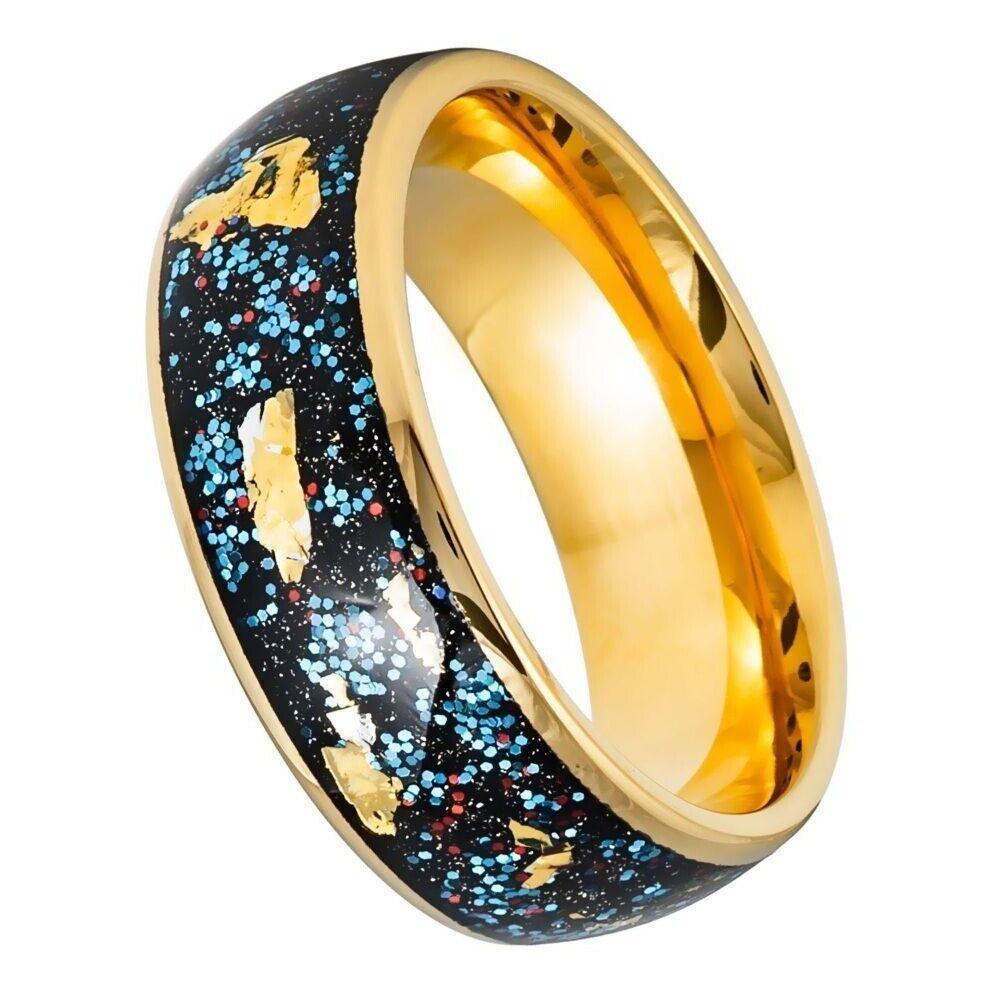 Blue Green Glitter & Gold Foil Yellow Inlay IP Dome Tungsten Ring - 8mm