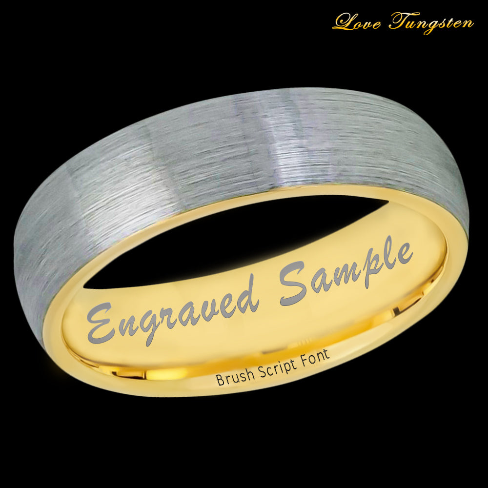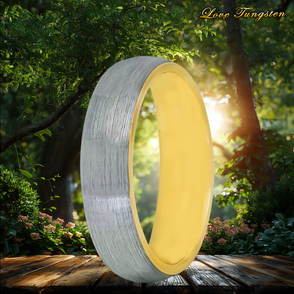 With its comfortable 6mm width, this ring is suitable for both men and women. Whether you're looking for a stylish everyday accessory or a wedding band that stands out, our Domed Yellow Gold IP Plated Inside & Gun Metal Brushed Tungsten Ring is an excellent choice.