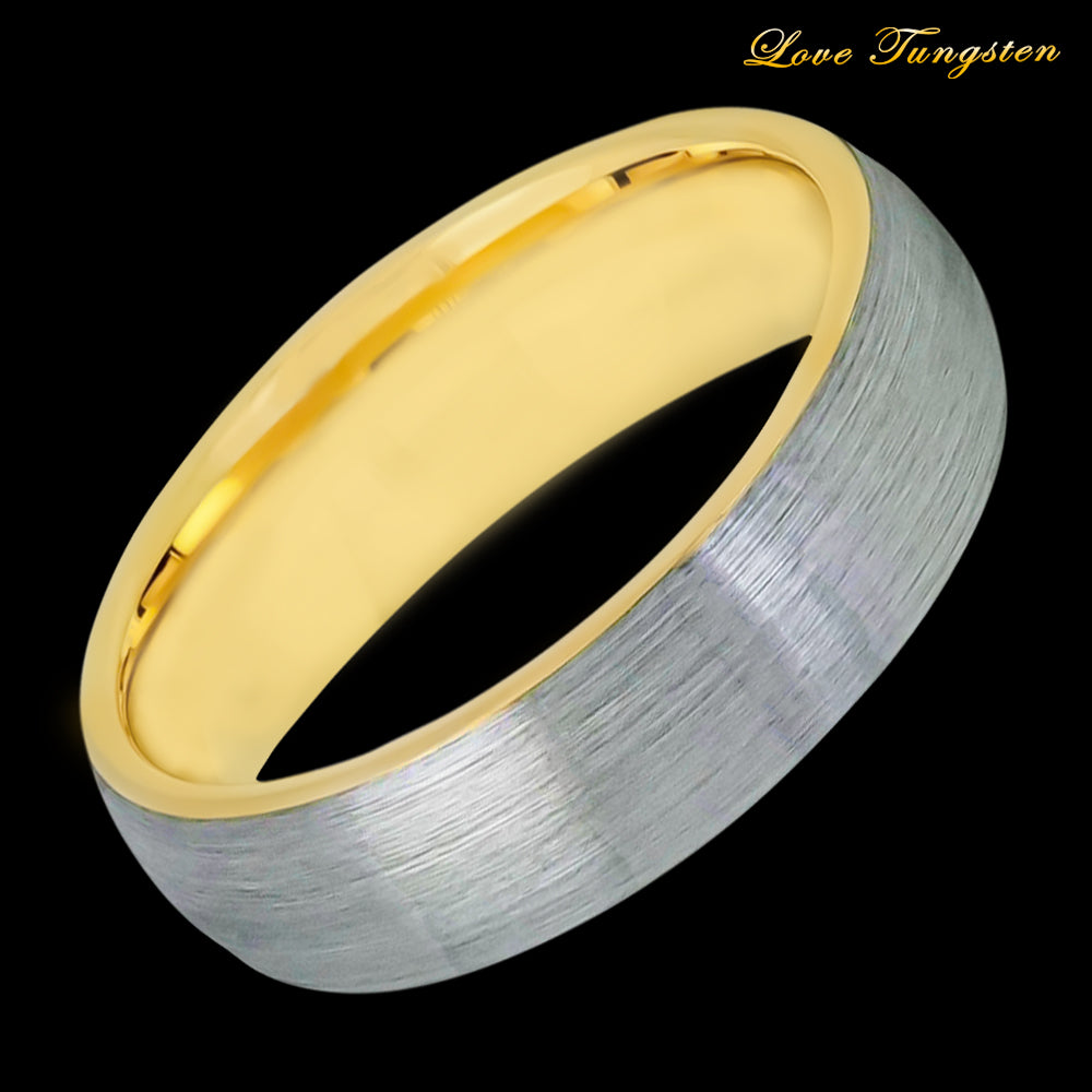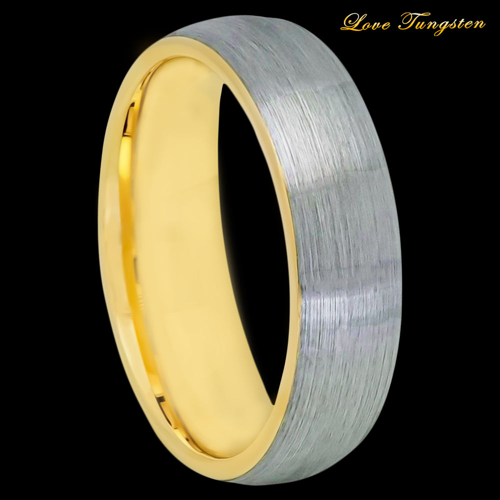 Experience the sleek and modern design of our Domed Yellow Gold IP Plated Inside & Gun Metal Brushed Tungsten Ring - 6mm. The domed shape and brushed finish create a sophisticated look that is perfect for any occasion.