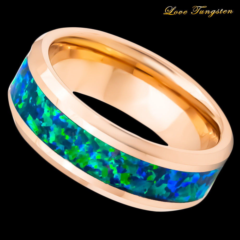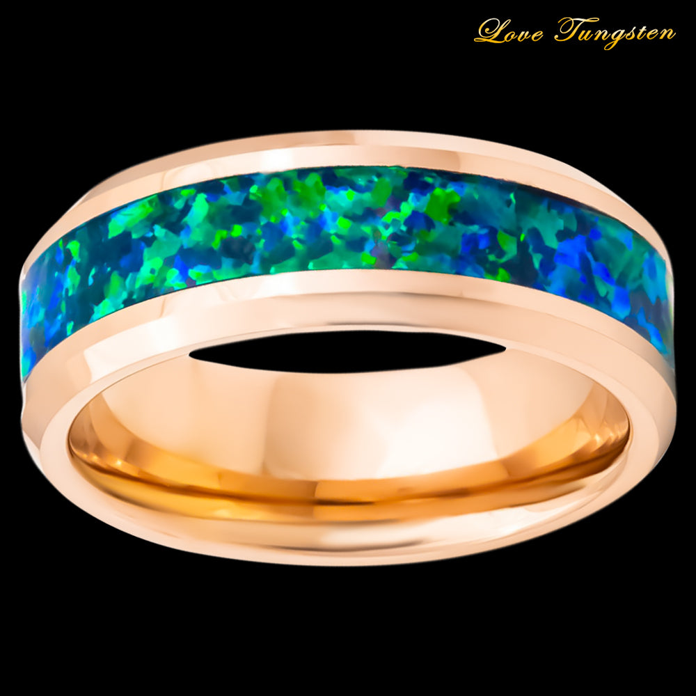 Shop now and elevate your style with the mesmerizing beauty of our 8mm Rose Gold IP Plated Tungsten Ring featuring an emerald-green opal inlay. Make a bold statement and add a touch of sophistication to your jewelry collection.