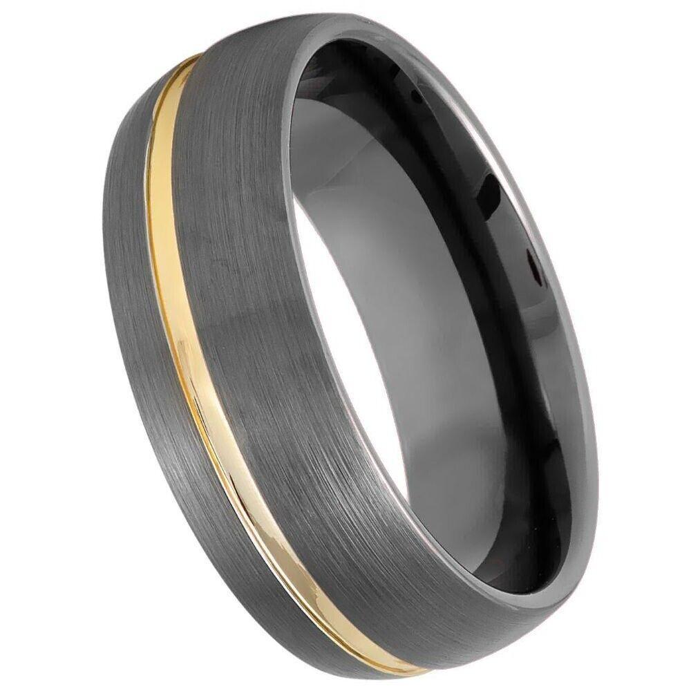 Crafted with attention to detail, this ring offers a comfortable fit and is built to last. The 8mm width provides a substantial presence without being overpowering. Whether you're looking for a modern wedding band or a fashion-forward accessory, our Gun Metal IP Plated Brushed Domed Ring with Off Center Yellow IP Strip is a perfect choice.