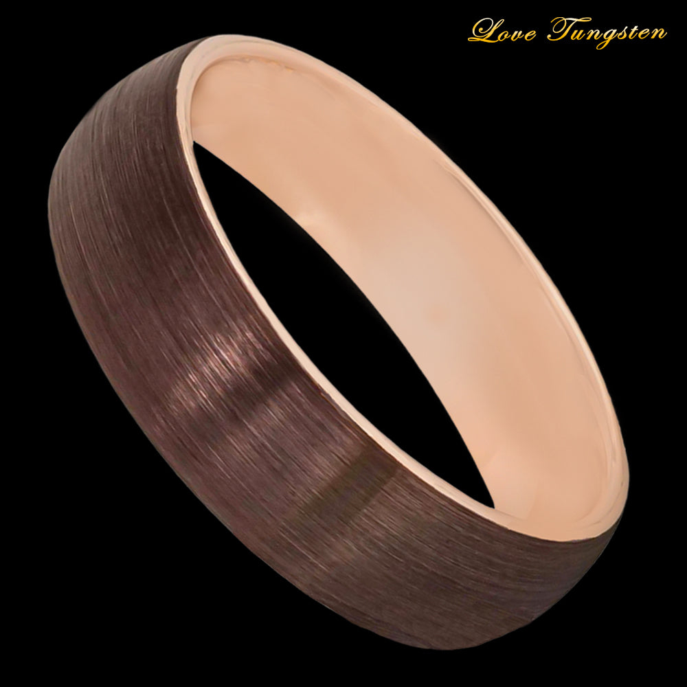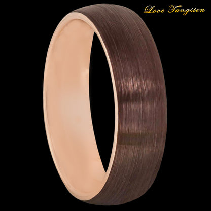 Embrace the modern yet timeless appeal of our Semi-Domed Brushed Brown IP Plated outside & Rose Gold Tungsten Ring - 6mm. Shop now and add a touch of sophistication to your jewelry collection.