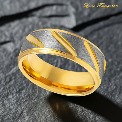 Two-tone Gray & Yellow IP Plated Notched Tungsten Ring – 8mm | Love Tungsten