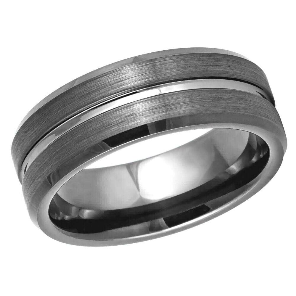 Unisex Gun Metal IP Center Brushed Grooved Beveled Edge Tungsten Ring - 8mm