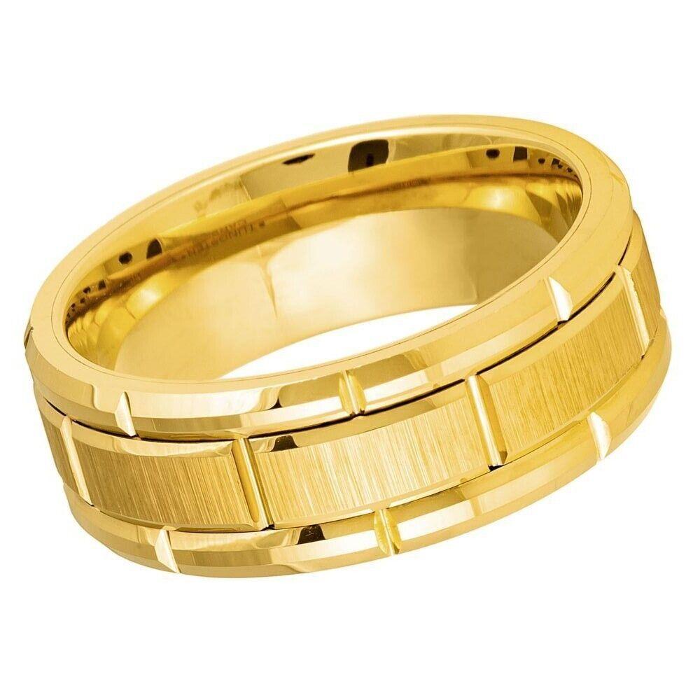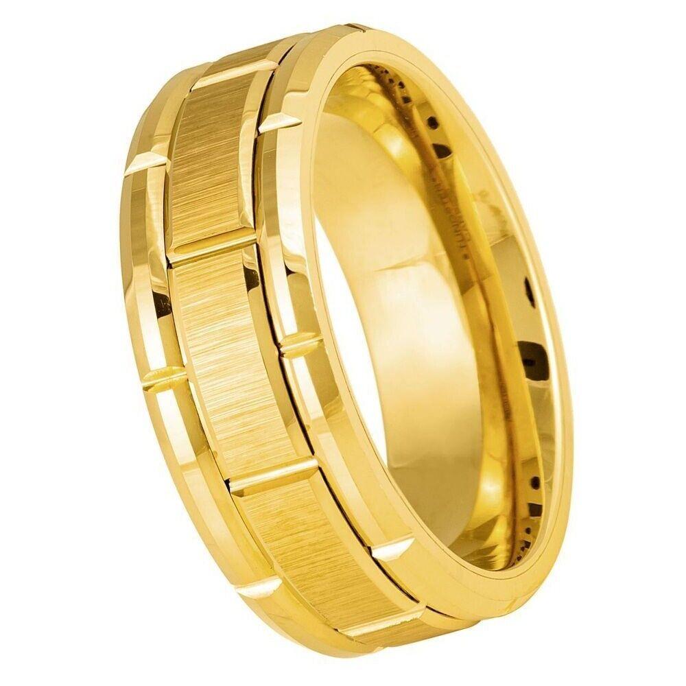 Experience the confidence that comes with wearing a statement piece like our 8mm Yellow IP Plated Brick Pattern Tungsten Ring. Elevate your style and make a lasting impression. Shop now and redefine your fashion game.